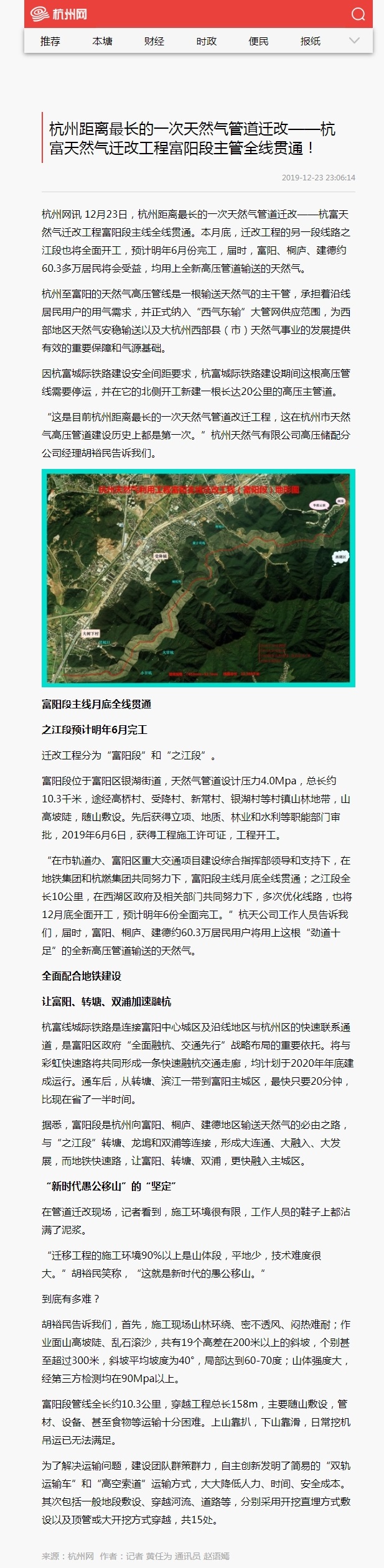 “在市軌道辦、富陽區(qū)重大交通項(xiàng)目建設(shè)綜合指揮部領(lǐng)導(dǎo)和支持下,在地鐵集團(tuán)和杭燃集團(tuán)共同努力下,富陽段主線月底全線貫通;之江段全長10公里,在西湖區(qū)政府及相關(guān)部門共同努力下,多次優(yōu)化線路,也將12月底全面開工,預(yù)計(jì)明年6份全面完工!焙继旃竟ぷ魅藛T告訴我們,屆時(shí),富陽、桐廬、建德約60.3萬居民用戶將用上這根“勁道十足”的全新高壓管道輸送的天然氣。